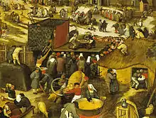No tragedies from the 6th century BCE and only 32 of the more than a thousand that were performed in during the 5th century BCE have survived.[25][26][lower-alpha 7] We have complete texts extant by Aeschylus, Sophocles, and Euripides.[27][lower-alpha 8] The origins of tragedy remain obscure, though by the 5th century BCE it was institutionalised in competitions (agon) held as part of festivities celebrating Dionysus (the god of wine and fertility).[28][29] As contestants in the City Dionysia's competition (the most prestigious of the festivals to stage drama) playwrights were required to present a tetralogy of plays (though the individual works were not necessarily connected by story or theme), which usually consisted of three tragedies and one satyr play.[30][31][lower-alpha 9] The performance of tragedies at the City Dionysia may have begun as early as 534 BCE; official records (didaskaliai) begin from 501 BCE, when the satyr play was introduced.[32][30][lower-alpha 10]