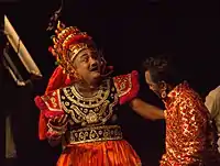 Under the patronage of royal courts, performers belonged to professional companies that were directed by a stage manager (sutradhara), who may also have acted.[39][42] This task was thought of as being analogous to that of a puppeteer—the literal meaning of "sutradhara" is "holder of the strings or threads".[42] The performers were trained rigorously in vocal and physical technique.[43] There were no prohibitions against female performers; companies were all-male, all-female, and of mixed gender. Certain sentiments were considered inappropriate for men to enact, however, and were thought better suited to women. Some performers played characters their own age, while others played ages different from their own (whether younger or older). Of all the elements of theatre, the Treatise gives most attention to acting (abhinaya), which consists of two styles: realistic (lokadharmi) and conventional (natyadharmi), though the major focus is on the latter.[43][lower-alpha 13]