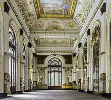 The place which was chosen for the construction was Morro do Chá, or Tea Hill, which had been the site of the new Teatro São José. Ramos de Azevedo was the engineer assigned to the construction. He was also helped by two Italian architects Cláudio Rossi and Domiziano Rossi. In 1903, construction began, and São Paulo gained one of the best venues in the world for the presentation of theatre productions, mainly operas. As it was customary in those days, the majority of the materials was imported from Europe, and the architectural reference was Palais Garnier of Paris.[2] The construction lasted about 8 years. The first staged production was the opera Hamlet by Ambroise Thomas. The initial idea was to present an opera Il Guarany, but the company, directed by an Italian Titta Ruffo, a celebrated baritone voice of the time, did not want to count on putting works by Brazilian composers in its repertoire. Also other problems had happened before the opening night. The stage decorations had not arrived in Brazil in time which caused the postponement of the opening date. When the new date arrived on 12 September 1911, the result surpassed all the expectations of the public and the city's dominant class.