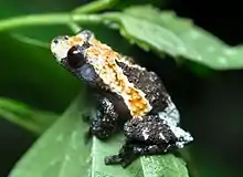They are medium to small-sized frogs with maximum snout–vent lengths that range from 2 to 7.5 cm (0.8 to 3.0 in) depending on species, and their skin can be smooth, warty or tuberculated.[3] The genus includes species that are contrastingly marked, but most are very well-camouflaged, resembling plant material (typically bark or moss) or bird droppings.[3][4]