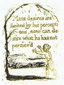 | Plate b3 (I) | ![]() | I Mans percepti- -ons are not bound -ed by organs of perception, he per- -cieves more than sense (tho' ever so acute) can discover | At the bottom of the plate, a gowned man with a beard lies on the ground, reading from a book. On the left is the stump of a tree. The first letter on the first line, "M", extends into a vine and reaches up to the heading. | From Copy G. Continuing the theme of reading from the previous plate, this picture is a mirror-image of the last one, but with subtle differences, which carry great thematic weight; "the vegetation near his head seems stunted, but the energetic scroll-like form above his body and the way the 'M' beginning the text bursts into vegetative form hint at energetic perceptions beyond the vision of this "bounded" reader."[46] Thus the 'barrier' formed by the tree in the previous plate is absent here, suggesting the possibility of the freedom of Man's spiritual faculties. |