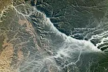 Smoke-filled canyons in northern Arizona, 2019. During morning and evening hours, dense smoke often settles in low-lying areas and becomes trapped due to temperature inversions—when a layer within the lower atmosphere acts as a lid and prevents vertical mixing of the air. Steep canyon walls act as a horizontal barrier, concentrating the smoke within the deepest parts of the canyon and increasing the strength of the inversion.[1]