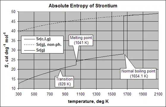 The absolute value of entropy for a substance in its standard state at the reference temperature of 298.15 K is designated S°298. Entropy increases with temperature, and is discontinuous at phase transition temperatures. The change in entropy (ΔS°) at the normal phase transition temperature is equal to the heat of transition divided by the transition temperature. The SI units for entropy are J/(mol·K).