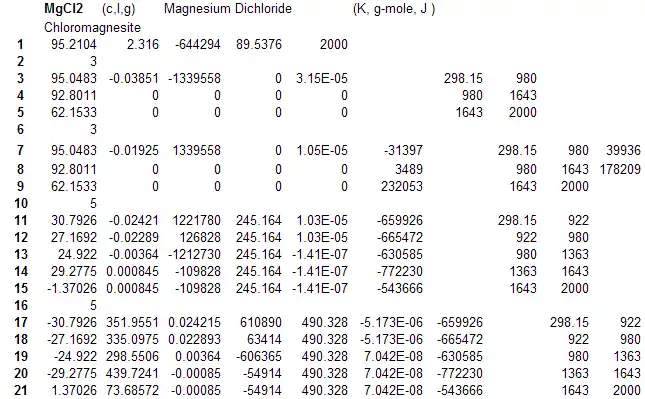 The table format is a common way to display thermodynamic data. The FREED table gives additional information in the top rows, such as the mass and amount composition and transition temperatures of the constituent elements. Transition temperatures for the constituent elements have dashes ------- in the first column in a blank row, such as at 922 K, the melting point of Mg. Transition temperatures for the substance have two blank rows with dashes, and a center row with the defined transition and the enthalpy change, such as the melting point of MgCl2 at 980 K. The datafile equations are at the bottom of the table, and the entire table is in an Excel worksheet. This is particularly useful when the data is intended for making specific calculations.