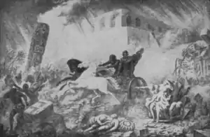 Before Christ visits these people there is a giant storm, a tremendous earthquake, and darkness. Cities burn, cities sink into the sea, mountains are brought down and valleys brought up. There is sharp lightning, wind, and thunderings and many people die. After the great storm comes darkness and the voices of mourning for the dead. The darkness lasts for approximately three days, during which a voice is "heard among all the inhabitants of the earth, upon all the face of this land, crying: Wo, wo, wo unto this people; wo unto the inhabitants of the whole earth except that they shall repent; for the devil laugheth, and his angels rejoice, because of the slain fair sons and daughters of my people; and it is because of their iniquities and abominations that they are fallen!" (3 Nephi 9:1-2) The voice then lists cities "and the inhabitants thereof" he had destroyed because of their wickedness: Zarahemla (3 Nephi 9:3), Moroni (9:4), Moronihah (9:5), Gilgal (9:6), Onihah, Mocum, and Jerusalem (the New World city founded by the Lamanites, Amelekites, and Amulonites,[5] not Jerusalem in Judaea) (9:7), Gadiandi, Gadiomnah, Jacob, and Gimgimno (9:8), Jacobugath (9:9), Laman, Josh, Gad, and Kishkumen (9:10), since "there were none righteous among them" (9:11). He asks, "O all ye that are spared because you were more righteous than they, will ye not now return unto me, and repent of your sins, and be converted, that I may heal you?" (9:13) "Yea, verily, I say unto you, if ye shall come unto me, ye shall have eternal life. Behold, my arm of mercy is extended towards you, and whosoever will come, him will I receive, and blessed are those that come unto me." (9:14) "Behold, I am Jesus Christ, the Son of God. I created the heavens and the earth, and all things that in them are. I was with the Father from the beginning. I am in the Father, and the Father in me; and in me hath the Father glorified his name." (9:15)