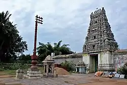 Thirukumaresar temple is located in Vridhachalam - Jayankondam highway, 13 km (8.1 mi) from Vridhachalam. The temple has a three-tiered gateway tower and all the shrines of the temple are enclosed in concentric rectangular granite walls. The temple occupies an area of around 0.5 acres (0.20 ha). The central shrine houses the image of Thirukumaresar in the form of Lingam. The shrine of Veramulai Amman, the consort of Shiva facing West is located in the Mahamandapam leading to the sanctum. The central shrine is approached through the flagstaff and Mahamandapam, both which are located axial to the gateway. As in other Shiva temples in Tamil Nadu, the shrines of Vinayaka, Murugan, Navagraha, Chandikesa and Durga are located around the precinct of the main shrine. The temple tank is located opposite to the temple and is called Nilorpala Theertham. There is a shrine for Thiruneelakanta Nayanar and Sattanathar at an elevated plane.[2] There are images of Thiruneelakanta Yazhpanar along with Mathanga Choodamaniyar. The shrines around the sanctum houses the images of Mahaganapathi, Viswanathar, Visalatchi, Murugar and Lakshmi.[3]