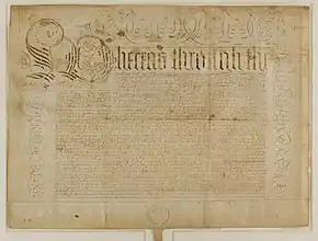 - Original Harvard Charter of 1650 listing Thomas Danforth as Treasurer