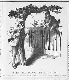 Among the first foreign policy challenges Bayard and Cleveland faced was that concerning American influence in the Samoan Islands.[106] The United States, Great Britain, and Germany all had treaties with the Samoan government that guaranteed their right to trade and establish naval bases there.[107] In the 1880s, German chancellor Otto von Bismarck began to increase German influence in Samoa, and attempted to replace the Samoan king, Malietoa Laupepa, with Tamasese Titimaea, a claimant to the throne who favored German suzerainty.[107] Bayard and Cleveland opposed any change that would undermine Samoan independence, as did the British government.[108] Bayard filed a note of protest with the German government, and the three powers agreed to meet for a conference in Washington in June 1887, but they failed to achieve any agreement.[109]