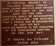 Kelly died at his residence, 31 East 130th Street in New York, on 5 February 1908.[15] He and his second wife, Anna Frances (née Dunne) (May 1860 – September 1913) are buried in Woodlawn Cemetery in the Bronx, New York City.[6] In 1987, on the centenary of the Fenian Rising, a commemorative plaque was placed at Kelly's ancestral home in Mountbellew.[3]