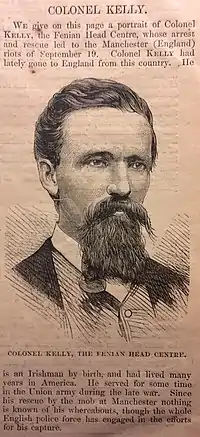 Kelly was wanted by the British authorities, and for a time managed to evade capture. But on 11 September 1867, Kelly, along with Timothy Deasy, was arrested in Manchester for loitering.[11] Though they gave their names as Martin Williams and John Whyte, they were soon identified and charged with more serious offences.[12] Seven days later, Kelly and Deasy were being transferred from the courthouse to the county jail on Hyde Road, Manchester, when about thirty supporters attempted to free them. During the attack, police sergeant Charles Brett, was killed, but Kelly and Deasy managed to escape. Three men arrested in connection with the attack were later executed, and thereafter known as the Manchester Martyrs. Both Kelly and Deasy escaped to the United States and were never recaptured. Kelly later obtained employment in the New York Custom House.[13]