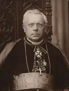 Heylen was named bishop of Namur on 23 October 1899 and was consecrated on 30 November. His emphasis was on encouraging religious devotion, promoting both mass pilgrimages and private retreats among the laity and emphasizing ongoing formation for the clergy.[1] In 1901 he became president of the Pontifical Committee for International Eucharistic Congresses, in succession to Victor Joseph Doutreloux, bishop of Liège.[2] He hosted the 1902 Eucharistic Congress in his own diocese, and personally presided at the International Eucharistic Congresses in Montreal (1910), Chicago (28th International Eucharistic Congress, 1926), Sydney (1928), Carthage (1930), Buenos Aires (1934) and Manila (1937).[1] During the First World War he was appointed vicar apostolic to French territory under German occupation. He maintained a "patriotic" line (refusing to host the King of Bavaria in his cathedral), and on two visits to Rome defended the outspokenness of Cardinal Mercier from critics in the Roman Curia, although he was not himself so outspoken.[1] He founded the diocesan schools of Saint-Michel in Neufchâteau (1909), Saint-Pierre in Bouillon (1910), and Sainte-Begge in Andenne (1925). He died in Namur on 27 October 1941.[1]