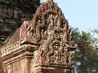 Thommanon is a single-towered temple with an east-facing central sanctuary, crowned by a prasat, or tower. Access from the east is via a gopura, followed by a mandapa, or antechamber, before arriving at the central sanctuary.[4]