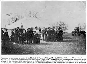 The October issue of Star of the West made room for remembering him while news continued of ʻAbdu'l-Bahá's travels and speeches and dedication of the cite for the Baháʼí House of Worship near Chicago. It included a long poem Chase composed.[149] This poem arrived in Egypt and was read to ʻAbdu'l-Bahá July 4, 1913.[150] The Star of the West edition also published letters from various communities memorializing him. Tributes from Portland, OR and Chicago were also published,[151][152] followed in March, 1913, by one from Beirut which included remembrance of those who were on pilgrimage and met him in 1907.[153] A letter/poem/ode from him to ʻAbdu'l-Bahá was published in September, 1913 dated from August, 1912, published as a one year anniversary of the visit of ʻAbdu'l-Baha to his gravesite[154] and was re-printed in 1922.[155] The editors noted the observance held for what was called "The day of Thornton Chase". It also reported more of the words ʻAbdu'l-Bahá had said on the visit to the gravesite:"…During his lifetime he bore many trials and vicissitudes, but he was very patient and long-suffering. He had a heart most illuminated, a spirit most rejoiced; his hope was to serve the world of humanity; during the days of his life he strove as much as he could – he never failed…"[156] There was an article then published including a picture marking Chase among the people standing at a Ridván meeting in May, 1909, who lead the services that day and compared the tent raised as a precursor to the eventual building.[157] It also included a short article by Chase "The Greatest Name".[158] An account of that first anniversary followed in the November edition.[159] 10 Baháʼís attended the gravesite Sep 30th with flowers and prayers for an hour and a service was held the following Sunday in a hall which was also the anniversary of ʻAbdu'l-Bahá's visit and the assemblage again returned to the gravesite at sunset. A memorial comment was then published from Thomas Kelly Cheyne.[160] In February 1914, an excerpt from Chase's book The Bahai Revelation was published in Star of the West.[161] The anniversary was noted again in 1914,[162] and then an article briefly reviewing the history of the religion in America by Chase was published in early 1915,[163] and again noted the anniversary in September.[164] A more enduring gravestone was placed in 1918.[165] A memoriam article in 1918 noted 21 Baháʼís attended the anniversary meeting which also saw the new stone marker. Mrs. Chase attended and shared anecdotes of his life.[166] A picture of the gravestone was published in 1920.[167]