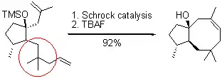 One application of this effect is addition of a quaternary carbon (e.g., a gem-dimethyl group) in an alkyl chain to increase the reaction rate and/or equilibrium constant of cyclization reactions. An example of this is an olefin metathesis reaction:[4] In the field of peptide foldamers, amino acid residues containing quaternary carbons such as 2-aminoisobutyric acid are used to promote formation of certain types of helices.[5]
