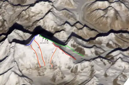 In 1988, Russell Brice and Harry Taylor successfully climbed the Three Pinnacles, but they were so exhausted after climbing the third pinnacle that they abandoned their original plan to continue along the normal route to the summit. Instead, they crossed the normal route along the north ridge and descended to the North Col.