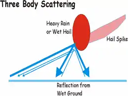 A hail spike or three body scatter spike (TBSS) is an artifact on a weather radar display indicative of large hail. They are identified by a spike of weak reflectivity echoes that extend out from a thunderstorm, and away from the radar site.