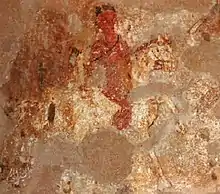 The wall paintings in the Throne Hall have suffered damage from rain water, termites and bats.[8] They are located at the staircase and in the central hall and show influences by Byzantine models.[28] The walls of the staircase had two layers of painted plaster, showing Archangel Michael wielding a spear, two warrior saints (one on foot and one on horseback) as well as several unidentifiable standing figures.[29]
