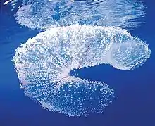 The pairing of males and females occurs at an immature stage where mantle length is less than 100mm and pairs remain monogamous.[15] Mating occurs in a head-to-head position, in which the male uses its hectocotylus to attach to the female's buccal membrane to transfer its spermatophores. Spawning is year round in tropical waters and lasts for 2–3 months, but in temperate regions spawning is more restricted to summer or early autumn periods and warmer currents. T. rhombus is known to be an intermittent spawner and is known to have multiple spawning in succession.[16] Females will produce secretions of gel-like substance from nidamental glands, similar to the Japanese flying squid, during spawning that will enter the water and swell. This swollen secretion will then be molded by the female into a cylinder. Female's oviductal glands will then begin to form two mucous threads, each with one row of eggs, which will fuse into a single cord containing a double row of eggs in the mantle cavity. The fused cord exits through into the water through the funnel where the eggs are met and fertilized with spermatozoa from seminal receptacles that were attached to the female's buccal membrane. The fertilized egg cord is then wound onto the cylinder. A female can produce 8 to 12 masses if properly utilizing its vitelline oocytes.[7]