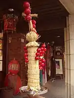 | Tanghulu | 糖葫蘆 | 糖葫芦 | táng húlu | ![]() | It is customary in Tianjin to eat Tanghulu on the eve of the Lunar New Year. The most popular tanghulu is made of hawthorn berries. Hawthorn berries have their seeds removed and are skewered on a thin bamboo stick, then dipped in hot syrup. When they turn cool, the stringed berries wrapped in crystallized sugar look like beautiful stone beans pungently sweet and sour. Sometimes, the hollowed hawthorn berries are filled with red bean paste, walnut and melon seeds. Today, in addition to hawthorn, a wide variety of tanghulu has been developed, including water chestnut, tangerine, apple, pear and crab-apple, etc. |