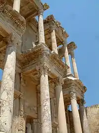 The Library of Celsus in Ephesus was built to honor Tiberius Julius Celsus Polemaeanus after his death. He paid for the library from his own personal wealth,[21] and bequeathed a large sum of money for its construction which was carried out by his son Julius Aquila Polemaeanus.[5] The library was built to store 12,000 scrolls and to serve as a monumental tomb for Celsus, being both a crypt containing his sarcophagus and a sepulchral monument to his memory.[22] The library collapsed after Ephesus was deserted but its façade was restored by an Austrian archaeology foundation in the 1970s.[23]