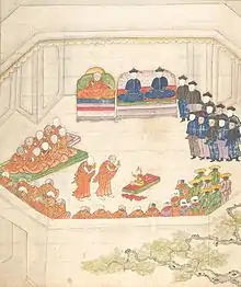 Temporal power was reasserted by the Dalai Lama in 1750. But the Qing Emperor re-organized the Tibetan government again and appointed new ambans.[60] These ambans or commissioners were not only unable to take charge, they were also kept uninformed. This reduced the post of the Residential Commissioner in Tibet to name only".[57] The number of soldiers in Tibet was kept at about 2,000. The defensive duties were partly helped out by a local force which was reorganized by the amban, and the Tibetan government continued to manage day-to-day affairs as before. The Emperor reorganized the Kashag to have four Kalöns in it.[61] He also used Tibetan Buddhist iconography to try and bolster support among Tibetans, whereby six thangkas portrayed the Qing Emperor as Manjuśrī and Tibetan records of the time referred to him by that name.[38][62]