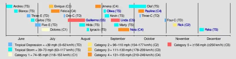 The 1997 Pacific hurricane season was the most active season since the 1994 season, producing 24 tropical depressions, 19 of which became tropical storms or hurricanes. The season officially started on May 15, 1997 in the Eastern Pacific—designated as the area east of 140°W—and on June 1, 1997 in the Central Pacific, which is between the International Date Line and 140°W. The season officially ended in both basins on November 30, 1997. These dates typically limit the period of each year when most tropical cyclones form in the eastern Pacific basin. This timeline documents all the storm formations, strengthening, weakening, landfalls, extratropical transitions, as well as dissipation. The timeline also includes information which was not operationally released, meaning that information from post-storm reviews by the National Hurricane Center, such as information on a storm that was not operationally warned on, has been included.