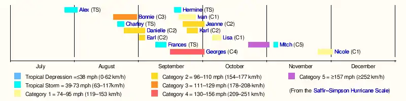 The 1998 Atlantic hurricane season was an event in the annual tropical cyclone season in the north Atlantic Ocean. This Atlantic hurricane season saw an above-average number of named tropical storms,[1][nb 1] and included a single-day record for number of hurricanes simultaneously in progress, with four active on September 25: Georges, Ivan, Jeanne and Karl.[3] The season officially began on June 1, 1998 and ended on November 30, 1998. These dates, adopted by convention, historically describe the period in each year when most tropical systems form.[4] Even so, this season's first storm, Tropical Storm Alex, did not form until July 27, while its last, Hurricane Nicole, dissipated on December 1.