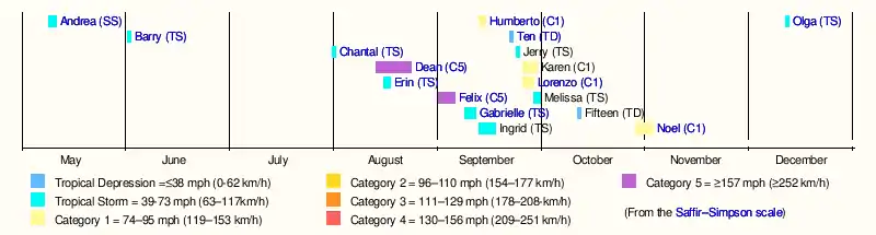 The season officially began on June 1, 2007, and ended on November 30, 2007, dates that conventionally delimit the period of each year when most tropical cyclones develop in the Atlantic basin.[3] The season's first storm, Subtropical Storm Andrea, developed from an extratropical cyclone that formed on May 6, and the last, Tropical Storm Olga, dissipated on December 11. Altogether, there were 15 named tropical storms during the 2007 season. Six storms attained hurricane strength with two intensifying further into major hurricanes.[nb 2]