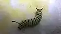 Yellowish white; 3rd and 12th segments, each with a pair of fleshy filaments, black and greenish white; each of the segments with four transverse black bars, the second bar on all broader than the others, bifurcated laterally, a yellow longitudinal line on each side; head, feet and claspers spotted with black.[3] The larva is around 1.21 centimetres (0.48 in) in length and weighs around 5 milligrams (0.077 gr) initially, but grows double that size and four times that weight within 48 hours.