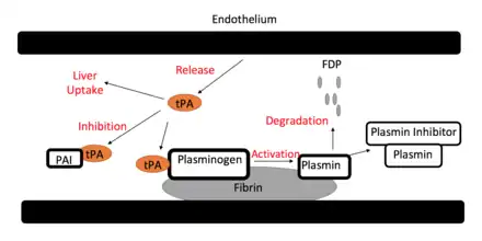 Once in the body, tPA has three main routes it can take, with one resulting in desired thrombolytic activity (see figure). For starters, following administration and release, tPA can be absorbed by the liver and cleared from the body through receptors present therein. One of the specific receptors responsible for this processes is a scavenger protein, specifically the LDL Receptor-Related Protein (LRP1).[35] tPA additionally can be bound by a plasminogen activator inhibitor (PAI), resulting in inactivation of its activity, and following clearing from the body by the liver. Lastly, tPA can bind plasminogen, cleaving off the bound plasmin from it. Plasmin, another type of protease, can either be bound by a plasmin inhibitor, or work to degrade fibrin clots, which is the highest utilized and desired pathway.[34]
