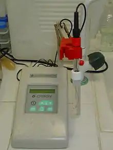 - pH meter: A potentiometer with an electrode whose potential depends on the amount of H+ ion present in the solution. (This is an example of an ion-selective electrode.) The pH of the solution is measured throughout the titration, more accurately than with an indicator; at the endpoint there will be a sudden change in the measured pH.