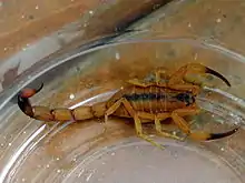 Tityus stigmurus is a species of scorpion from the family Buthidae that can be found in Brazil. The species are 4.5–6 centimetres (1.8–2.4 in) in length and are either golden-tan or yellowish-brown coloured. It takes them a year to mature into an adult, which makes them a fast-growing species. They also have a dark stripe over the mesosoma with either yellowish or orange pedipalps.[2]