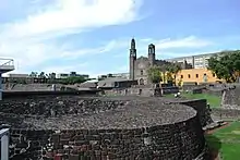 Tlatelolco is an archaeological excavation site in Mexico City, Mexico where remains of the pre-Columbian city-state of the same name have been found. It is centered on the Plaza de las Tres Culturas. On one side of the square is this excavated Tlatelolco site, on a second is the oldest European school of higher learning in the Americas called the Colegio de Santa Cruz de Tlatelolco, and on the third stands a mid-20th-century modern office complex, formerly housing the Mexican Foreign Ministry, and since 2005 used as the Centro Cultural Universitario of UNAM (National University of Mexico).[1]