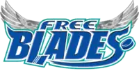 The Free Blades' logo consists of the word Free Blades written on two lines as solid blue letters with a light blue and white outline. The L is replaced with a hockey stick and a puck is featured at the end of the word "Blades". The text is set on a pair of white wings. It is also stylized with the "B" and "S" having extended points and the "S" also featuring a sweeping bottom stroke. All letters are capitalized.[5]