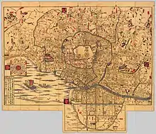 The system of sankin kōtai meant that daimyos and their families often resided in Edo or travelled back to their domains, giving demand to an enormous consumer market in Edo and trade throughout the country.[15][17] Samurai and daimyos, after prolonged peace, are accustomed to more elaborate lifestyles.[18] To keep up with growing expenditures, the bakufu and daimyos often encouraged commercial crops and artifacts within their domains, from textiles to tea.[18] The concentration of wealth also led to the development of financial markets.[15] As the shogunate only allowed daimyos to sell surplus rice in Edo and Osaka, large-scale rice markets developed there.[15] Each daimyo also had a capital city, located near the one castle they were allowed to maintain.[12] Daimyos would have agents in various commercial centers, selling rice and cash crops, often exchanged for paper credit to be redeemed elsewhere.[12] Merchants invented credit instruments to transfer money, and currency came into common use. In the cities and towns, guilds of merchants and artisans met the growing demand for goods and services.[19]