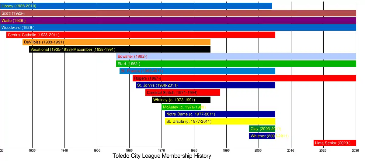 - The league begins in 1926 with the first boys track and field meet held May 1. The charter members were Libbey, Scott, Waite, and Woodward. The 1926–27 school year was the first for full City League play.[3]