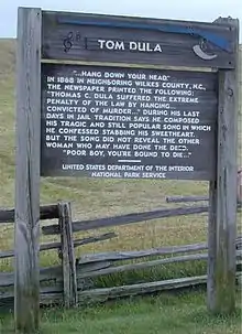 Thomas C. Dula (June 22, 1845 – May 1, 1868)[1][2] was a former Confederate soldier who was convicted of murdering Laura Foster. National publicity from newspapers such as The New York Times turned Dula's story into a folk legend. Although Laura was murdered in Wilkes County, North Carolina, Dula was tried, convicted, and hanged in Statesville. Considerable controversy surrounded the case. In subsequent years, a folk song was written (entitled "Tom Dooley", based on the pronunciation in the local dialect), and many oral traditions were passed down, regarding the sensational occurrences surrounding Laura Foster's murder and Dula's subsequent execution.[1][3] The Kingston Trio recorded a hit version of the murder ballad in 1958.[4]