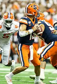 DeVito redshirted his true freshman season. He served mostly as the backup to starting quarterback Eric Dungey as a redshirt freshman, playing in eight games off the bench and completing 44 of 87 passes for 525 yards and 4 touchdowns.[9][10] DeVito's first significant action came on September 15, 2018 against Florida State, entering the game after Dungey suffered an injury and completing 11 of 16 passes for 144 yards and a touchdown while also rushing for a touchdown as the Orange won 30–7.[11] DeVito again played in relief of an injured Dungey on October 10 against North Carolina, and he led Syracuse to a 40–37 win in double overtime, throwing for 181 yards with three touchdowns and one interception on 11-for-19 passing.[12][13] As a redshirt sophomore, DeVito passed for 2,360 yards and 19 touchdowns and rushed for 122 yards and two touchdowns.[14][15] He passed for a career-high 330 yards, three touchdowns and an interception in a 63–20 loss to Maryland.[16]
