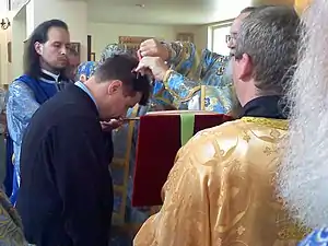 Clerical tonsure (note the scissors in the bishop's hands) of an Orthodox man in conjunction with ordination to minor orders.