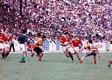 In 1985 Ridnell was named to the United States national rugby union team, the Eagles, under coach Ron Mayes. Earning his first cap as Eagle No. 168, in his first match for Jim Perkins,[4] he started at Blind-Side Flanker (No. 6), against Australia in the 1987 Rugby World Cup.[5][6] In 1989, he would suffer a knee injury with thoughts of never being able to play again. He returned to international play at the 1991 Rugby World Cup starting against Italy at No. 8 losing 30-9 at Cross Green, England.[4][7] Ridnell became an accomplished 7s player leading the pack at every Hong Kong Sevens tournament from 1989 to 1993 under Eagles 7s Coach Emil Signes. Having established himself at the Canberra, Fiji, and Hong Kong Sevens Tournaments he earned a spot representing the United States in the first Sevens World Cup.[8]