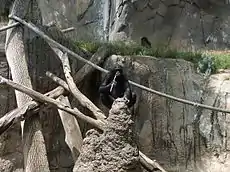 Captive western lowland gorillas have been observed to threaten each other with sticks and larger pieces of wood, while others use sticks for hygienic purposes. Some females have attempted to use logs as ladders.[58] In another group of captive gorillas, several individuals were observed throwing sticks and branches into a tree, apparently to knock down leaves and seeds.[59] Gorillas at Prague zoo have used tools in several ways, including using wood wool as "slippers" when walking on the snow or to cross a wet section of the floor.[29]