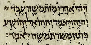 The Talmud holds that the Torah was written by Moses, with the exception of the last eight verses of Deuteronomy, describing his death and burial, being written by Joshua.[42] Alternatively, Rashi quotes from the Talmud that, "God spoke them, and Moses wrote them with tears".[43][44] The Mishnah includes the divine origin of the Torah as an essential tenet of Judaism.[45] According to Jewish tradition, the Torah was recompiled by Ezra during Second Temple period.[46][47]