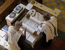 Torah reading (Hebrew: קריאת התורה, K'riat HaTorah, "Reading [of] the Torah") is a Jewish religious ritual that involves the public reading of a set of passages from a Torah scroll. The term often refers to the entire ceremony of removing the Torah scroll (or scrolls) from the ark, chanting the appropriate excerpt with traditional cantillation, and returning the scroll(s) to the ark. It is distinct from academic Torah study.