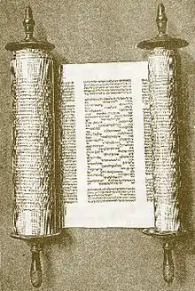 The Torah (/ˈtɔːrə, ˈtoʊrə/; Biblical Hebrew: תּוֹרָה Tōrā, "Instruction", "Teaching" or "Law") is the compilation of the first five books of the Hebrew Bible, namely the books of Genesis, Exodus, Leviticus, Numbers and Deuteronomy.[1] In that sense, Torah means the same as Pentateuch or the Five Books of Moses. It is also known in the Jewish tradition as the Written Torah (תורה שבכתב, Torah She’bichtav). If meant for liturgic purposes, it takes the form of a Torah scroll (Sefer Torah). If in bound book form, it is called Chumash, and is usually printed with the rabbinic commentaries (perushim).