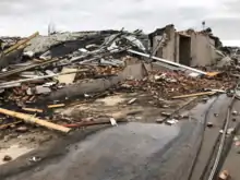 Several rounds of intense severe thunderstorms brought significant damaging winds, very large hail, and several tornadoes primarily across the Southern United States from April 9 into the evening of April 11.[73] April 9 started with several clusters of multi-cells, supercells, and bowing segments across much of the Deep South. Strong straight-line thunderstorm winds in Shreveport, Louisiana toppled a tree onto a mobile home around 6:30 p.m. (23:30 UTC), resulting in a fatality.[74] Several large hail-producing supercells then formed and moved through areas from Oklahoma to North Texas before merging into a large squall line and surging southeastward into Arkansas and Louisiana, producing widespread wind damage. Meanwhile, several tornado-producing supercells formed ahead of the line. A weak EF0 tornado was recorded by several storm spotters near Pelahatchie, Mississippi, causing intermittent tree damage. Just after midnight on April 10, a large EF1 tornado ripped roofs off of sheds and carports and knocked down trees, including some that fell on homes, near Columbia, Mississippi. To the southwest, a low-end EF3 tornado tossed vehicles and damaged or destroyed several homes and mobile homes in the rural community of Waxia near Palmetto, Louisiana just after 2:00 a.m. CDT (07:00 UTC), resulting in one fatality and seven injuries.[75][76] Later that morning, the squall line produced multiple tornadoes in the Florida Panhandle. A strong tornadic waterspout came onshore in Laguna Beach, Florida, causing severe EF2 damage to a business and damaging several homes. Another tornadic waterspout struck Gulf Lagoon Beach, located at the southeastern edge of the Panama City Beach city limits and caused EF0 damage to beach furniture. In Lynn Haven, an EF1 tornado caused considerable damage to an automotive business.[77][78] That afternoon, isolated to widely scattered severe storms formed from the Great Lakes to the Carolinas, producing sporadic wind and hail damage as well as isolated tornadoes into the overnight hours. An EF1 tornado also caused damage to businesses and a radio tower, and flipped a car near Seneca, South Carolina.[78] A brief EF0 tornado damaged a few homes near Cutlerville, Michigan, and another EF0 tornado damaged a home near Reidville, South Carolina.[79][80] Early on April 11, another EF1 tornado caused damage to homes and outbuildings near Belvoir, North Carolina.[81] That afternoon, another squall line pushed southeastward down the entire Florida panhandle, producing mainly wind and hail damage, although a brief EF0 tornado that caused minor tree damage was confirmed near Eagle Lake.[82] Another non-tornadic fatality occurred near Spring Hill when a person got out of their car after it was struck by a fallen tree and was electrocuted when they came in contact with downed power lines.[83] Overall, the outbreak generated 20 tornadoes, resulting in one fatality. Two other non-tornadic deaths also occurred as a result of the severe weather. There was also at least $635 million in damage.[71]