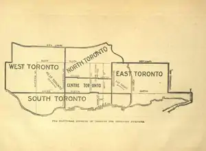 It initially consisted of the portion of the city of Toronto, including Toronto Island, lying west of the River Don and south of Queen Street. In 1924, it was redefined to consist of the part of the city of Toronto south of Dundas Street, west of Jarvis Street, and east of Atlantic Avenue and Dovercourt Road, together with Toronto Island.