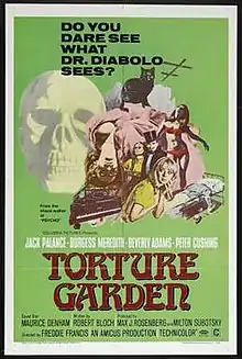 Torture Garden is a 1967 British anthology horror film directed by Freddie Francis and starring Burgess Meredith, Jack Palance, Michael Ripper, Beverly Adams, Peter Cushing, Maurice Denham, Ursula Howells, Michael Bryant and Barbara Ewing. The score was a collaboration between Hammer horror regulars James Bernard and Don Banks.