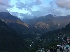Tosh village is in Himachal Pradesh state of India. It is located at about 2,400 metres (7,900 ft) in elevation on a mountain slope on the right bank of the Parvati River in the Parvati Valley, surrounded by mountains (TOSH is the last village).[1][2] The main occupation of the people in Parvati valley is Tourism. Apple orchards are also a big source of income for the local people. Wooden houses in the village are excellent example of architecture of Mountain people. Tosh is less expensive than its neighbour town Kasol. The guest houses and the hotels are available both at the entrance and far end of the village.[3] Alongside the village is a right-bank tributary of the Parvati River. The Parvati River begins at the Mantalai Glacier within the Parvati Valley.[4] The peaks surrounding the glacier include Papasura, White Sail, Angduri, Pinnacle, and Devachan.[5] Tosh village is reached by bus from Kullu to Barshaini via Kasol and Manikaran and then a one-hour hike.[2][6][7] It is described as a "traditional village turned hippie colony".[7]