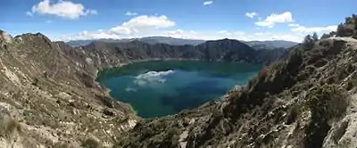Quilotoa it is a water-filled boiler and the westernmost volcano in the Ecuadorian Andes. The 3-km-wide boiler was formed by the collapse of this dacite volcano following a catastrophic eruption 800 years ago, which produced pyroclastic flows and lahars that reached the Pacific Ocean, and spread in the air a deposit of volcanic ash along the northern Andes. The boiler has accumulated a depth of 250 m crater lake, which has a greenish color as a result of dissolved minerals. Vents are on the bottom of the lake and hot springs occur on the eastern flank of the volcano.