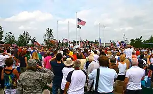 Over 1,500 people convened on Walter M. Kenney Field to witness the ceremony, including area residents, public officials, active military personnel, veterans organizations, and members of the Patriot Guard Riders.[2][16] Invitations had been sent to those that made financial contributions to fund the memorial, but the event was open to the public and received significant media attention in anticipation of Powell's address.[15]